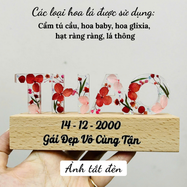 1. Thông tin sản phẩm: Đèn ngủ hoa khô nghệ thuật được làm theo tên hoặc nội dung theo yêu cầu riêng của khách hàng. Phù hợp dùng làm đèn ngủ, đèn led trang trí phòng ngủ, đèn decor phòng ngủ chill.