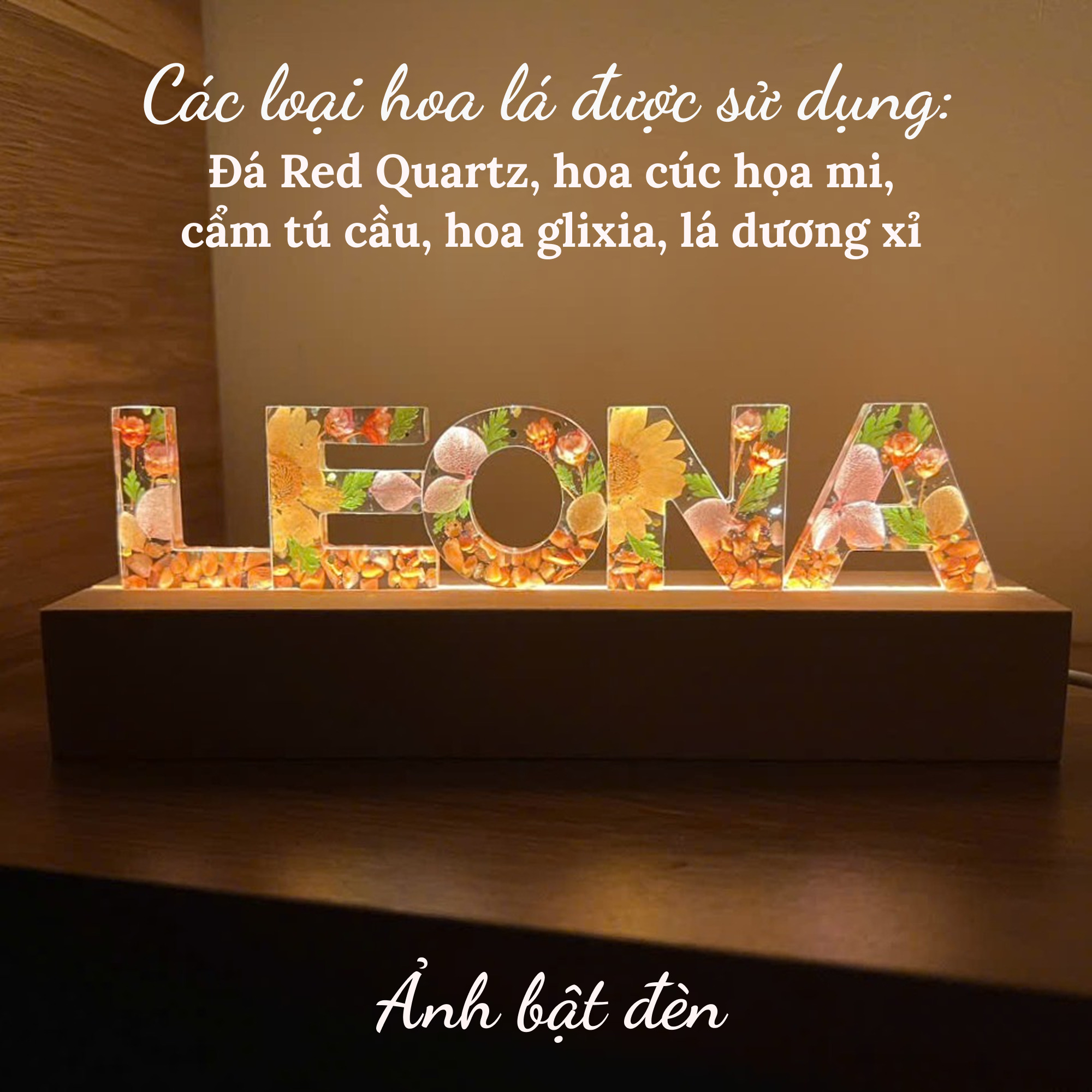 1. Thông tin sản phẩm: Đèn ngủ hoa khô nghệ thuật được làm theo tên hoặc nội dung theo yêu cầu riêng của khách hàng. Phù hợp dùng làm đèn ngủ, đèn led trang trí phòng ngủ, đèn decor phòng ngủ chill.